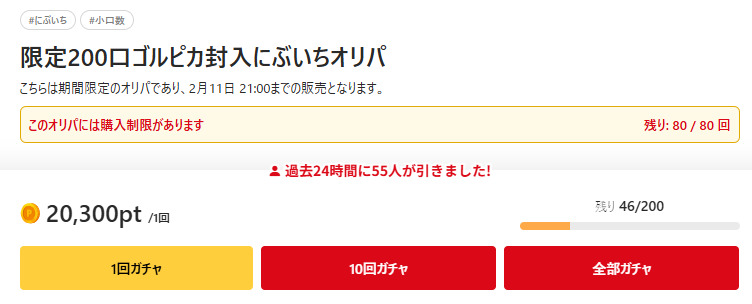 総口数が少ないガチャについては、「全部ガチャ」で一気に全部引かれる可能性もあるため、早めに引くかどうかの判断が必要です。