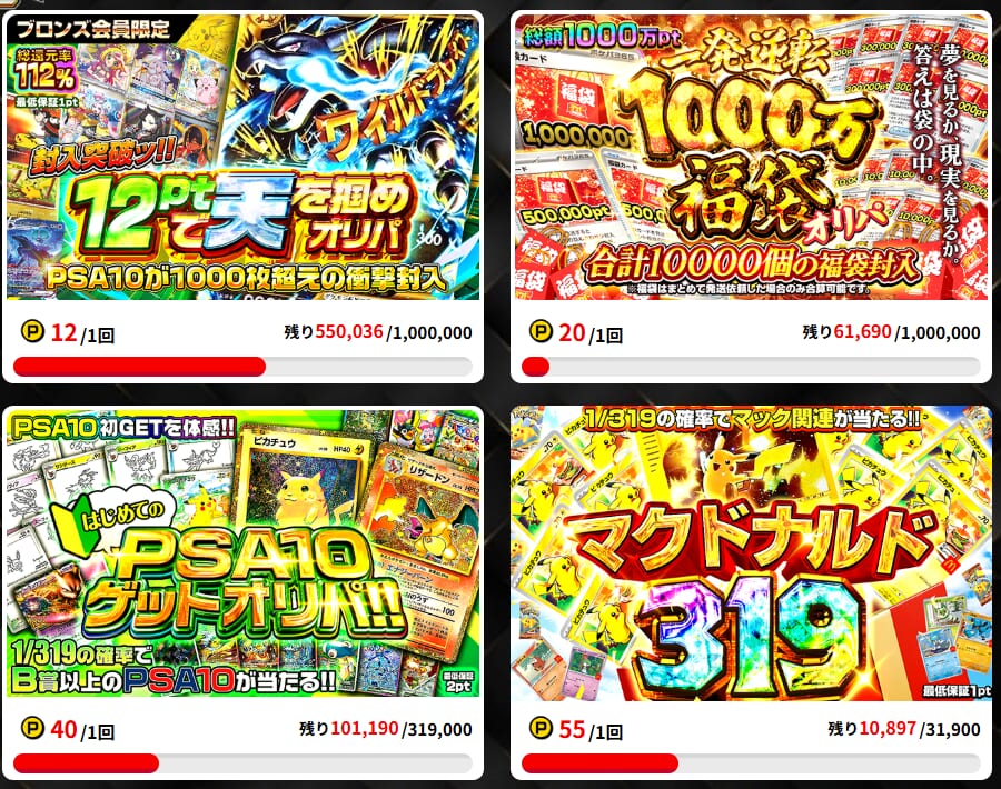「微課金でも爆アドを引けた」という口コミもあり、狙い目のオリパサービスですよ。