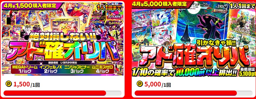 1ptオリパは回数制限が付いていますが、アド以上確定なのでぜひチャレンジしてくださいね。