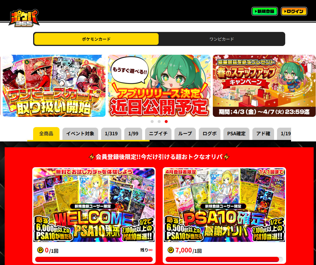 ポケパ365は、ポケモンカードとワンピースカードをメインに取り扱うオンラインオリパです。