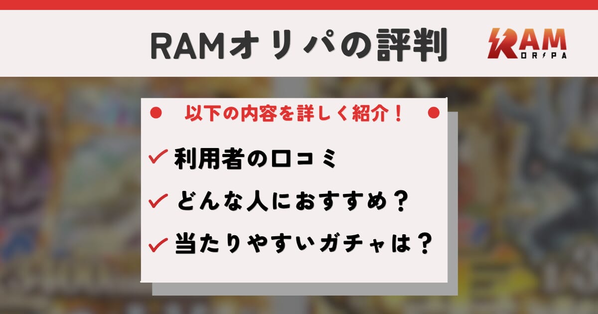 この記事では、RAMオリパの評判について、オンラインオリパとしての特徴や利用者の口コミなどをまとめました。