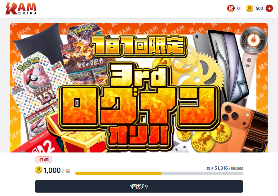 RAMオリパは、アド確定ガチャや損しないログボオリパを販売しており、お得なキャンペーンも多数開催しています。