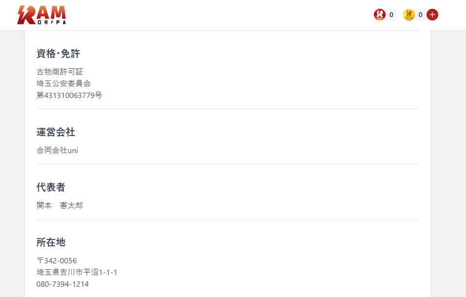 RAMオリパは、公式サイト上に古物商許可証の番号や運営会社が明記されているサイトです。