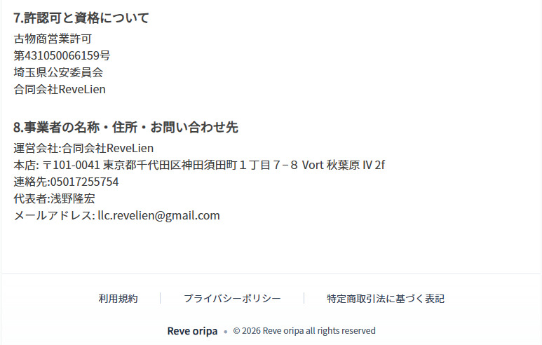 公式サイトでは、Reveオリパの特定商取引法に基づく表記があります。