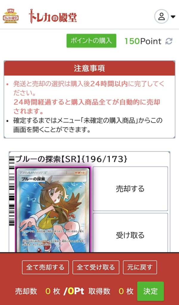 トレカの殿堂のオリパから獲得した商品は、発送依頼の「受け取る」か、ポイント変換の「売却」を選択できます。