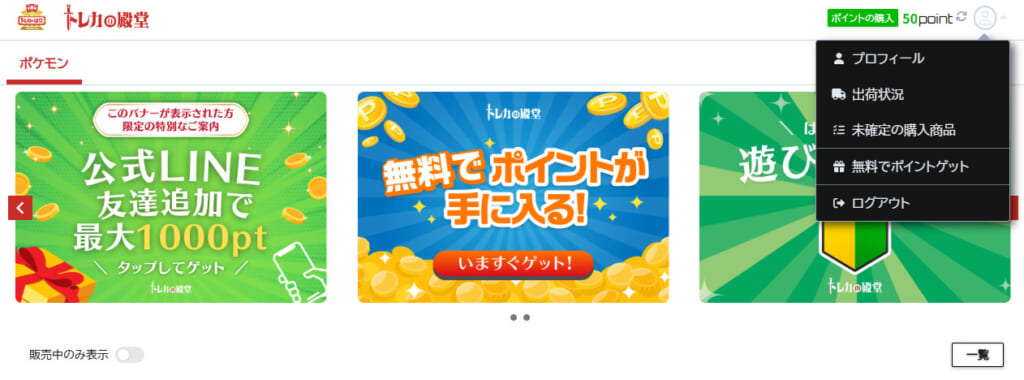 トレカの殿堂にログインすると、画面右上にアイコンが常に表示されています。